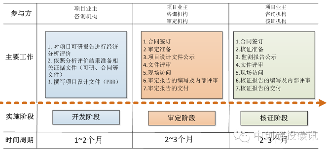 除上述项目开发流程,一个CCER项目成功备案并获得减排量签发,还需经过国家发改委的审核批准过程。由上述项目审定及减排量签发程序,可以推算国家主管部门组织专家评估并进行审核批准的时间周期在60~120个工作日之间,即大约需要3~6个月时间。