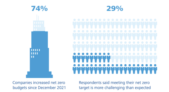 减排目标或其他相关目标,但他们不愿公开目标(图1)。此外,74%的受访企业增加了净零预算,近30%企业表示,实现目标比预期更具有挑战性(图2)。