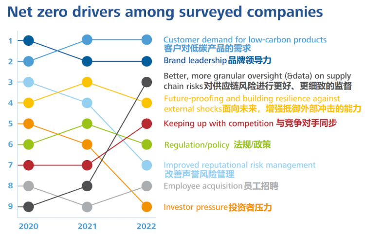 在2020-2022年的减排驱动因素中,客户需求和品牌领导力位列前二,说明企业减排的动力大多来自外部。管控供应链风险由2021年的第8位骤升至2022年的第3位(图3),说明企业的内驱力在迅速增长。受访企业中,37%认为实现净零目标需要对供应链风险进行更好、更细化的监督,对风险防范的重视也让企业对公布目标更为谨慎。