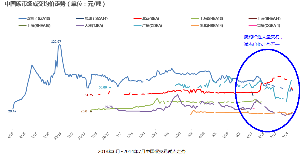 当然,我们以上将的因素都是在市场相对成熟,交易比较活跃,市场参与者已经建立对碳价长远预期这样的情况下才能影响市场价格。目前国内市场仍然未达到这个阶段。国内7个试点在2014年6~7月迎来首个配额清缴期,交易额大幅上升,但