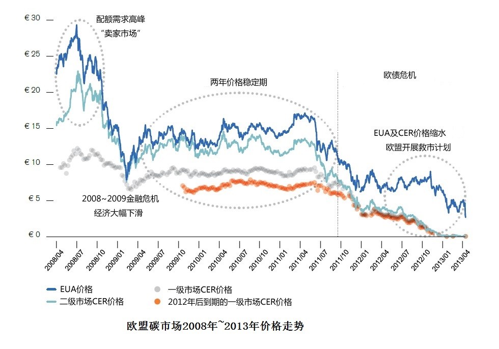 问题归根结底是发展问题”,说的是在不同的经济体之间经济越发达排放越多,限制排放就是限制发展,尤其是对发展中国家不公平。这个道理对于同一个经济体的不同时间段同样成立,经济形势变好则生产加大,能耗变多,对配额的需求增加,导致价格上升,反之亦然。欧盟在2008年的经济危机后出现经济衰退,大量的公司倒闭,工人失业,直接导致了能源需求的下降,使得碳价从每吨二十多欧元下跌到只有两三欧元。