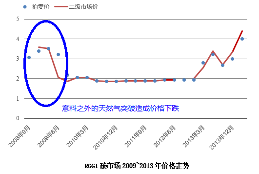 我们知道,天然气比煤炭清洁,风能、太阳能更是零排放,但清洁能源的高价格阻碍了我们大量的使用它们。因此,当能源的相对价格出现变化,往往就会导致能源使用的变化,从而推动碳价的变化。还是以RGGI为例,当年美国在本土实现页岩气的大规模开采,大大降低了页岩气(天然气)的价格,从而使得大量的发电公司弃煤用气,其排放远远小于制度设计时的预期,导致了价格的大幅下跌。