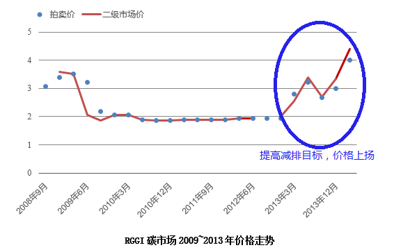 碳市场是一个政府创造出来的市场,市场的供需是政府通过一定的配额分配规则决定。如果政府决定要比基准年份减少更多的温室气体,将直接导致配额发放减少,进而推动碳价上升。在现实中,美国的RGGI为了提振低迷的碳价,直接将企业的配额削减了45%,相当于对企业提出了更高的减排目标,直接推动碳价上扬。而全球最大的碳市场EU ETS在2013年也进行推迟配额拍卖的改革,减少市场配额数量,提振碳价。